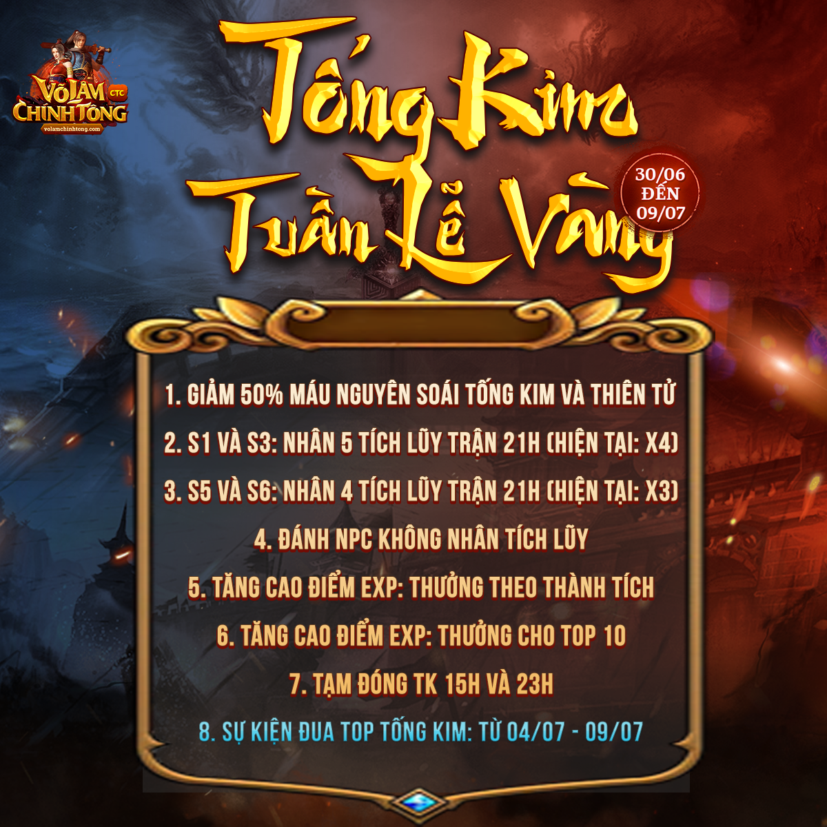- Sự kiện Đua Top Tống Kim sẽ diễn ra từ 04/07 đến 09/07 (Hoạt động đua top cá nhân. Chi tiết sẽ công bố sau)