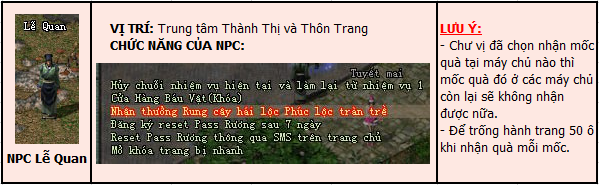 - Đối với các gói quà trong game, chư vị sẽ nhận tại NPC Lễ Quan.