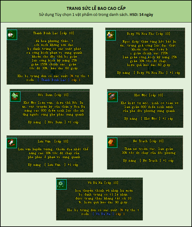 - Các vật phẩm có hạn sử dụng 14 ngày, đây là hạn sử dụng theo cơ chế giảm dần giúp chư vị thuận tiện trong việc xếp chồng các vật phẩm.