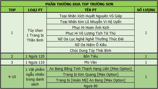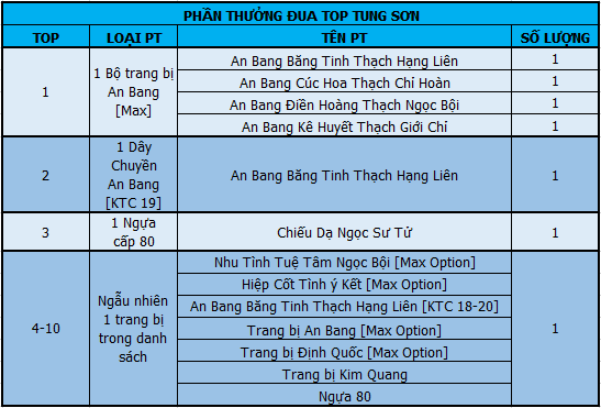 IV. PHẦN THƯỞNG BẢNG XẾP HẠNG: Căn cứ vào số nến tích luỹ được, đại hiệp nào có nến tích luỹ cao nhất đến khi kết thúc sự kiện sẽ nhận được phần thưởng tương ứng với thứ hạng.