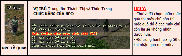 - Đối với các gói quà trong game, chư vị sẽ nhận tại NPC Lễ Quan.