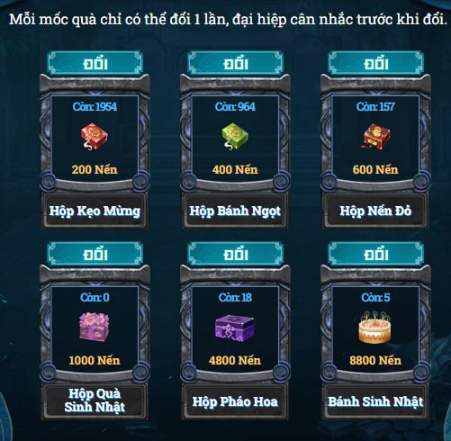 - Khi bấm đổi quà hệ thống sẽ trừ đi tương ứng số nến đã đổi quà.