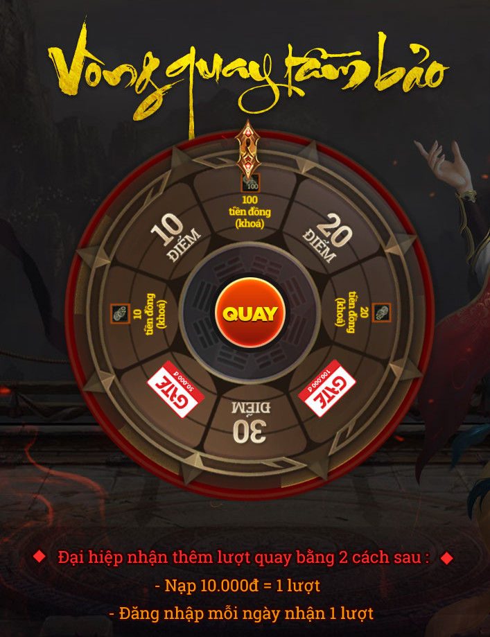 - Cứ mỗi 10.000đ được nạp vào game, ngoài số tiền đồng sẽ được nhận như bình thường thì sẽ nhận sẽ nhận 1 lượt quay