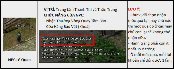 Đối với các gói quà trong game, đại hiệp sẽ nhận tại NPC Lễ Quan. Khi bấm nhận quà ở trang sự kiện, đại hiệp vui lòng thoát và đăng nhập lại vào game để nhận.