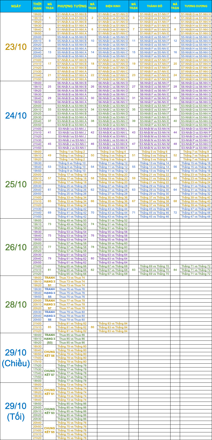 • Lịch thi đấu vòng bảng: Ngày 22/10/2023