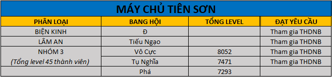 - Đồng thời các bang hội tham gia đạt yêu cầu vui lòng tiến hành ghi danh cập nhật danh sách 45 ứng cử viên tham gia giải đấu Thiên Hạ Đệ Nhất Bang để chuẩn bị bước vào vòng loại Đệ Nhất Bang