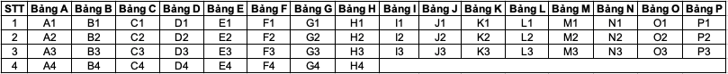 - Bảng I, J, K, L, M, N, O, P: Có 3 đội