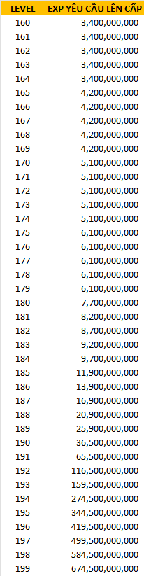 Để đồng bộ hệ thống Exp chuẩn bị sát nhập máy chủ, cụm máy chủ Giang Sơn sẽ sử dụng hệ thống kinh nghiệm lên cấp tương tự cụm máy chủ Trường Sơn, tại một số mốc level của cụm máy chủ Trường Sơn sẽ yêu cầu exp thấp hơn so với Giang Sơn cho nên sẽ có trường hợp một số chư vị tại Giang Sơn sau khi cập nhật lại game sẽ được lên thẳng cấp tiếp theo, thông tin chi tiết sự thay đổi của các mốc level chư vị vui lòng theo dõi bảng sau: