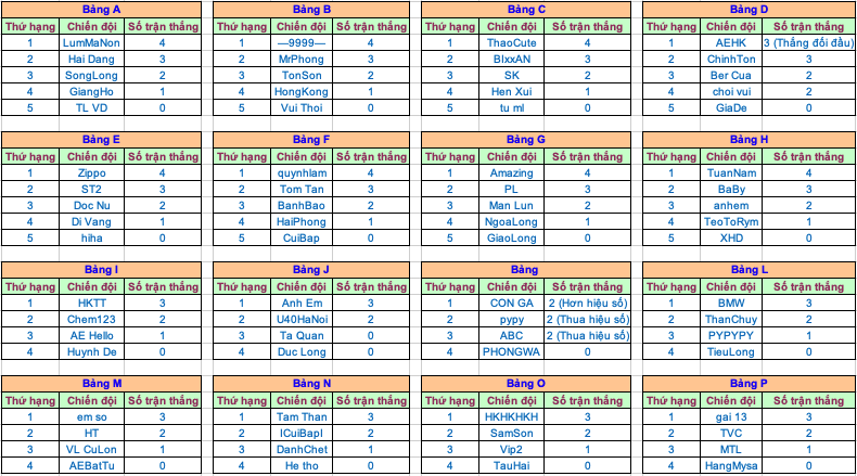 - Bảng D: Đội AEHK và ChinhTon bằng điểm nhau, nhưng AEHK thắng ChinhTon ở trận đối đầu nên xếp ở vị trí cao hơn