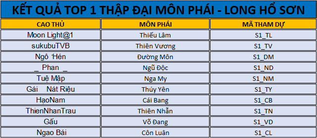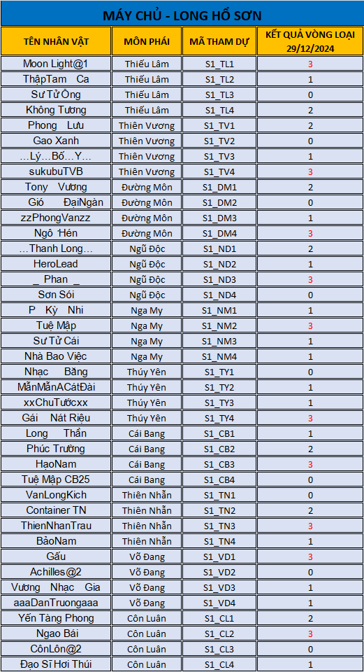 KẾT QUẢ VÒNG LOẠI - MÁY CHỦ LONG HỔ SƠN: 29/12/2024