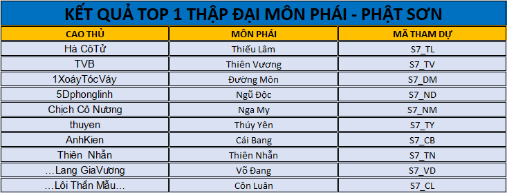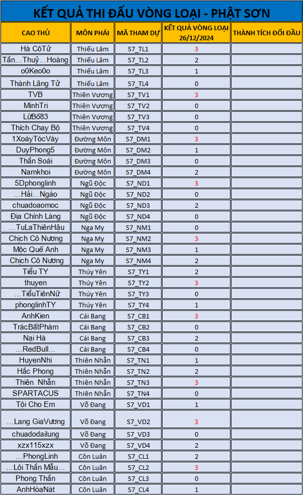 KẾT QUẢ VÒNG LOẠI - MÁY CHỦ PHẬT SƠN: 26/12/2024