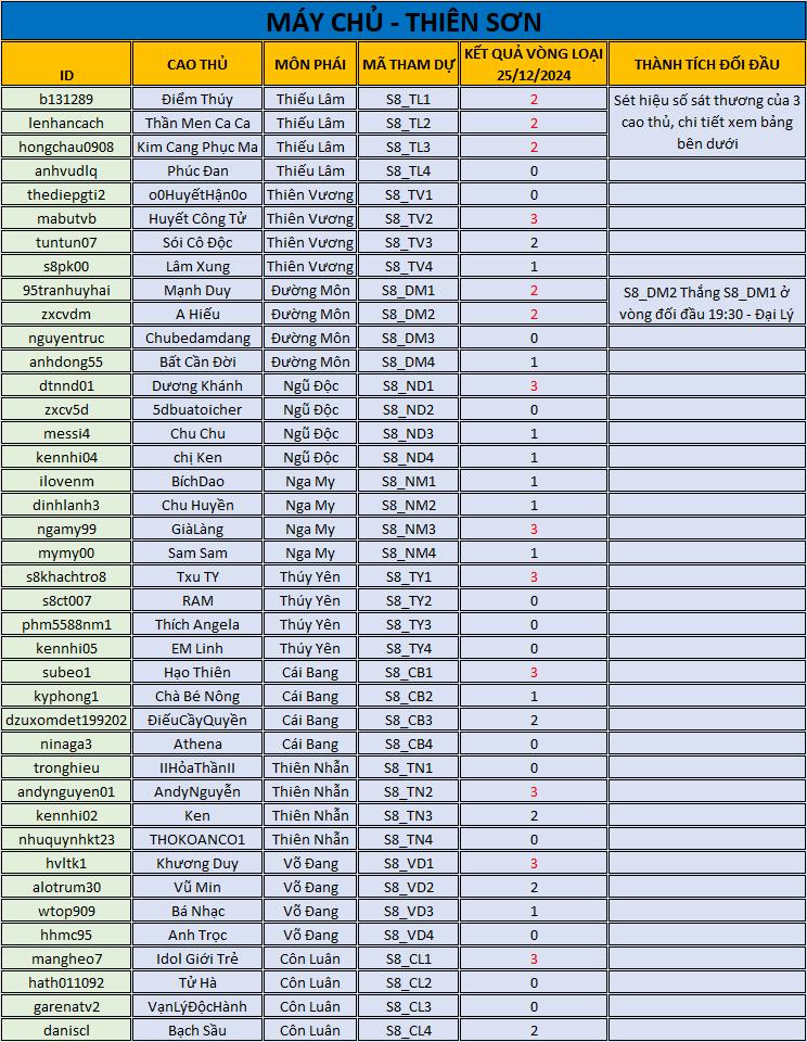 KẾT QUẢ VÒNG LOẠI - MÁY CHỦ THIÊN SƠN: 25/12/2024