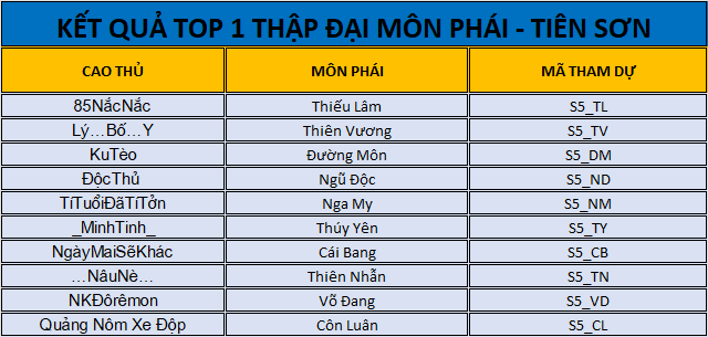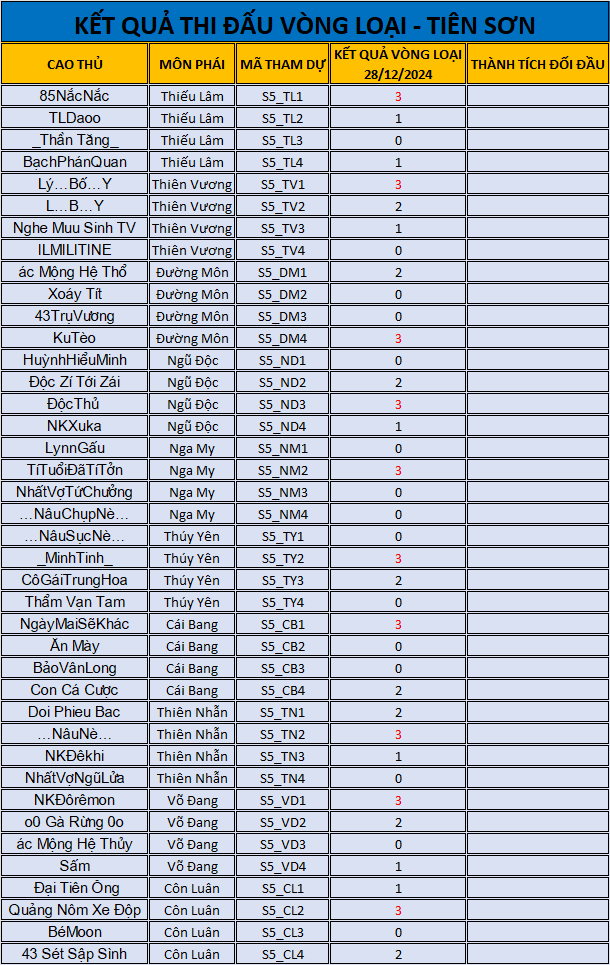KẾT QUẢ VÒNG LOẠI - MÁY CHỦ TIÊN SƠN: 28/12/2024