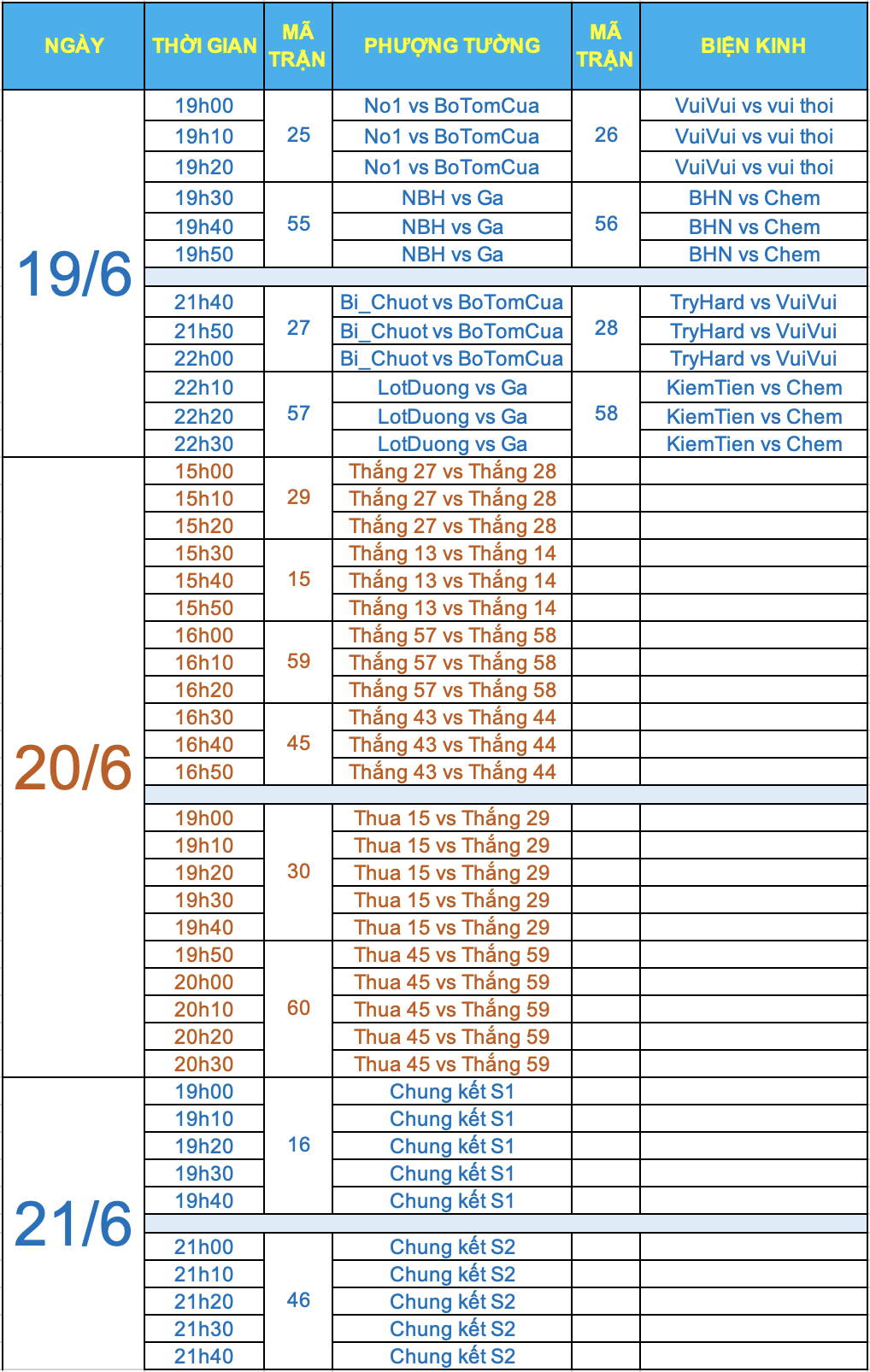 LỊCH ĐẤU NGÀY 19/6 - TIẾP THEO