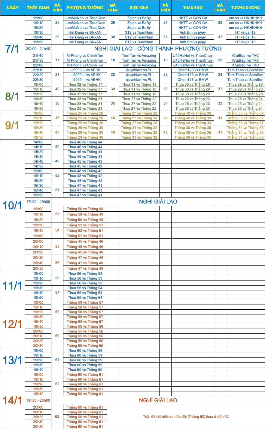 LỊCH THI ĐẤU NGÀY 07/01