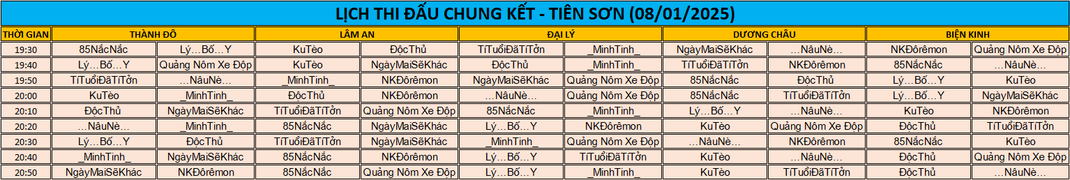 LỊCH THI ĐẤU VÒNG LOẠI - MÁY CHỦ TIÊN SƠN: 08/01/2025