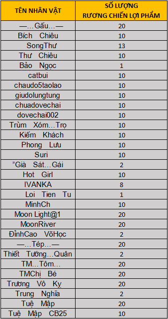| 3 | o0HuyếtHận0o | 279 | 9,900,000 | 2,762,100,000 |