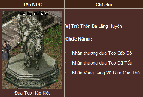 - Trao thưởng dựa trên bảng xếp hạng ở NPC Đua Top Hào Kiệt