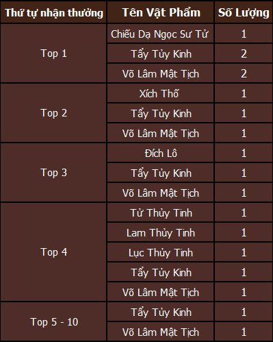 - Phần thưởng sẽ trao theo thứ tự của Top xếp hạng.