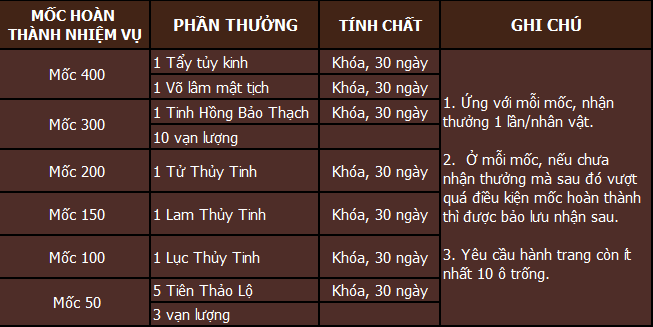 - Mỗi nhân vật chỉ nhận tối đa 01 lần phần thưởng.