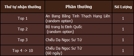 - Phần thưởng này sẽ phát thưởng cho 10 nhân vật có thứ tự nhận đầu tiên từ 1 đến 10: