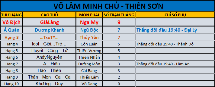 Xin chúc mừng Minh Chủ Già Làng và chân thành cám ơn các cao thủ tại máy chủ Thiên Sơn đã cống hiến 1 giải đấu hấp dẫn, đồng thời cám ơn chư vị huynh đệ đã quan tâm và theo dõi giải đấu trong suốt thời gian qua!